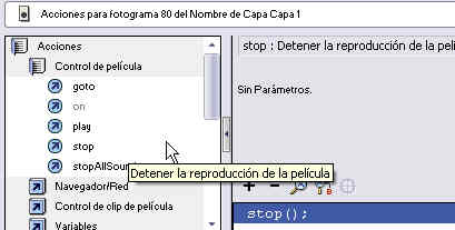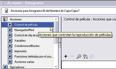 El la parte izquierda se encuentran las distintas categorías de acciones y nosotros haremos clic sobre Acciones y después sobre la categoría de control de película para desplegar su contenido.